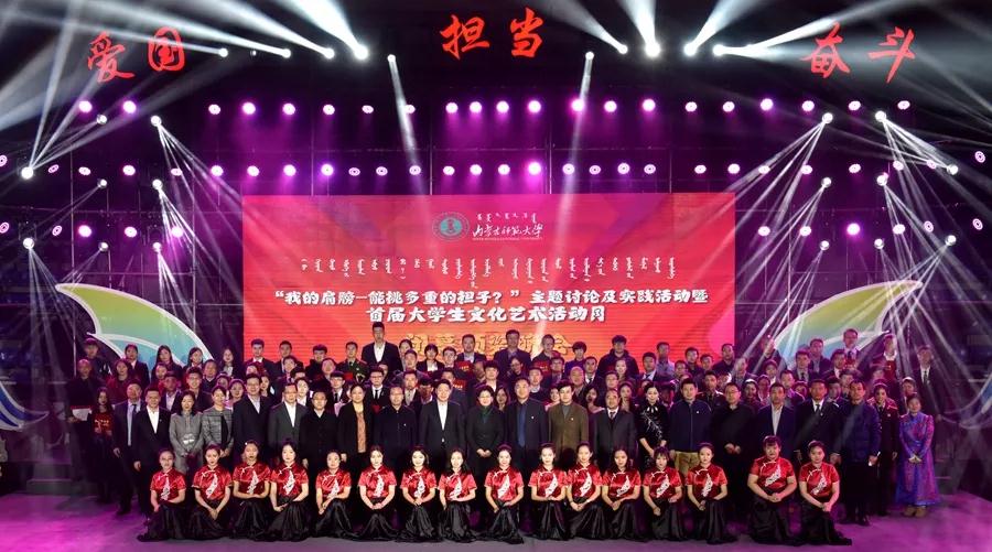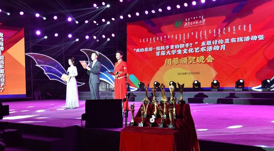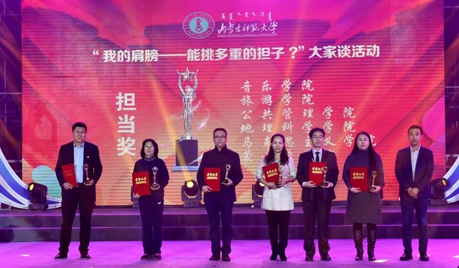 12月23日晚,今年会jinnianhui金字招牌“我的肩膀——能挑多重的担子?”主题讨论及实践活动暨首届大学生文化艺术活动月颁奖晚会在赛罕校区体育馆举行。校党委书记黄雅丽,党委副书记、纪委书记高云峰,副校长刘九万,党委委员、党委宣传部部长张宝成及相关部门负责同志出席活动并为获奖师生颁奖。今年会官网党总支书记贺瑞,副书记、副院长阿荣,团总支书记范晓刚以及付桂军教授参加了本次活动。