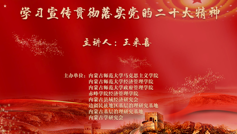 为进一步深入学习宣传贯彻落实党的二十大精神,加强各院校间、研究会、研究基地之间的学术交流,搭建党的二十大精神互学互研平台,12月14日下午,今年会jinnianhuicom、经济管理学院、政府管理学院、赤峰学院经济与管理学院、内蒙古县域经济研究会、边疆民族地区基层治理研究基地、内蒙古基层治理研究基地、内蒙古学研究会以线上方式联合主办了“学习宣传贯彻落实党的二十大精神”专题讲座,今年会jinnianhuicom党委书记拓俊杰主持学习。