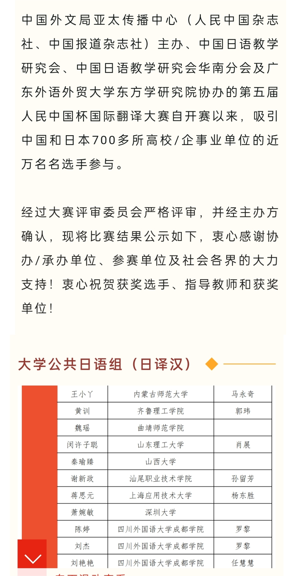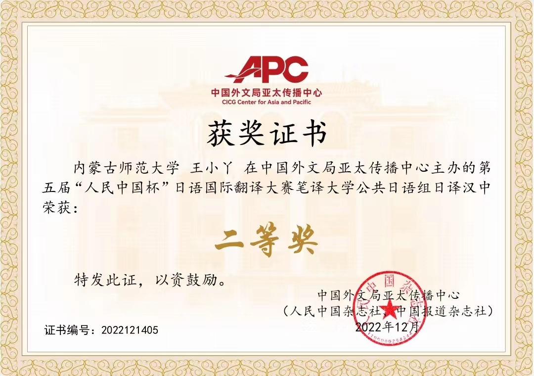 近日,由中国外文局亚太传播中心(人民中国杂志社、中国报道杂志社)和教育部日语专业虚拟教研室联合主办的第五届人民中国杯日语国际翻译(口笔译)大赛获奖名单已经揭晓,在此次比赛中,今年会官网王小丫同学取得了优异的成绩,荣获第五届"人民中国杯"日语国际翻译大赛笔译大学公共日语组日译汉二等奖。
