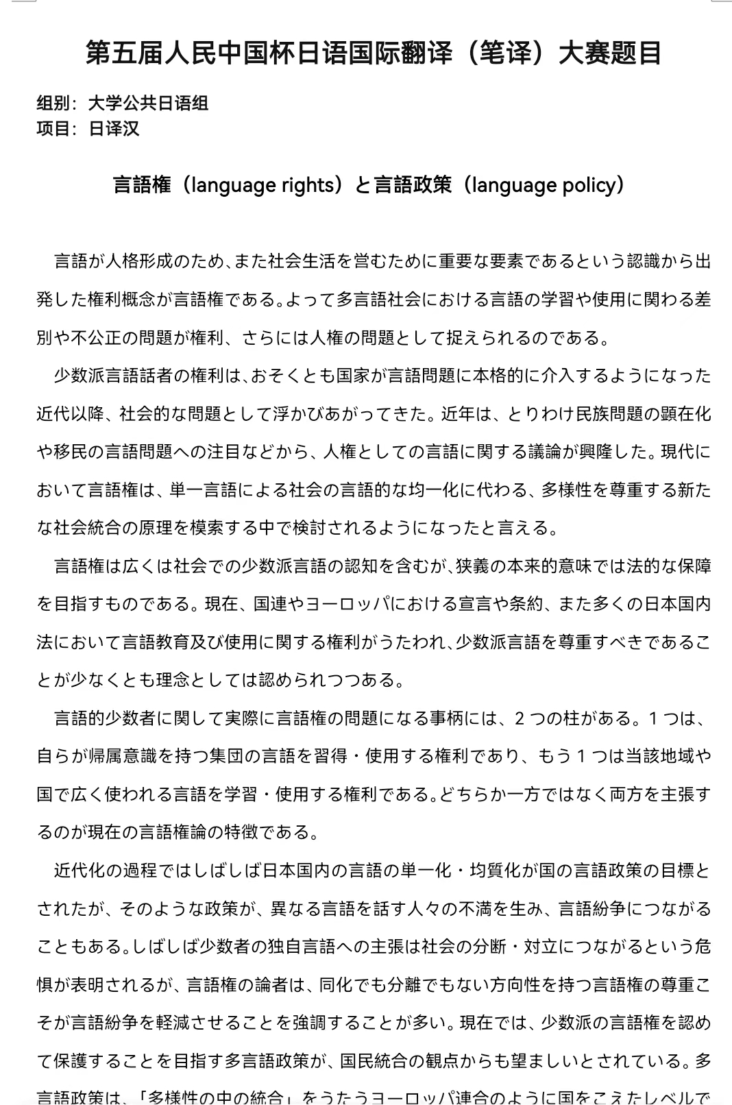 第五届人民中国杯日语国际翻译(口笔译)大赛是由中国外文局亚太传播中心(人民中国杂志社、中国报道杂志社)和教育部日语专业虚拟教研室联合主办,由中国日语教学研究会、中国日语教学研究会华南分会及广东外语外贸大学东方学研究院协办,广东省翻译协会及广州市联普翻译有限公司承办。大赛本着“以赛促学,以赛促教,以赛促创”的初衷,致力于为两国翻译爱好者搭建交流的桥梁,为促进中日翻译事业的发展贡献力量。