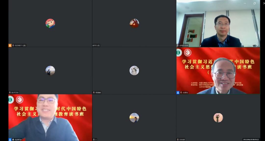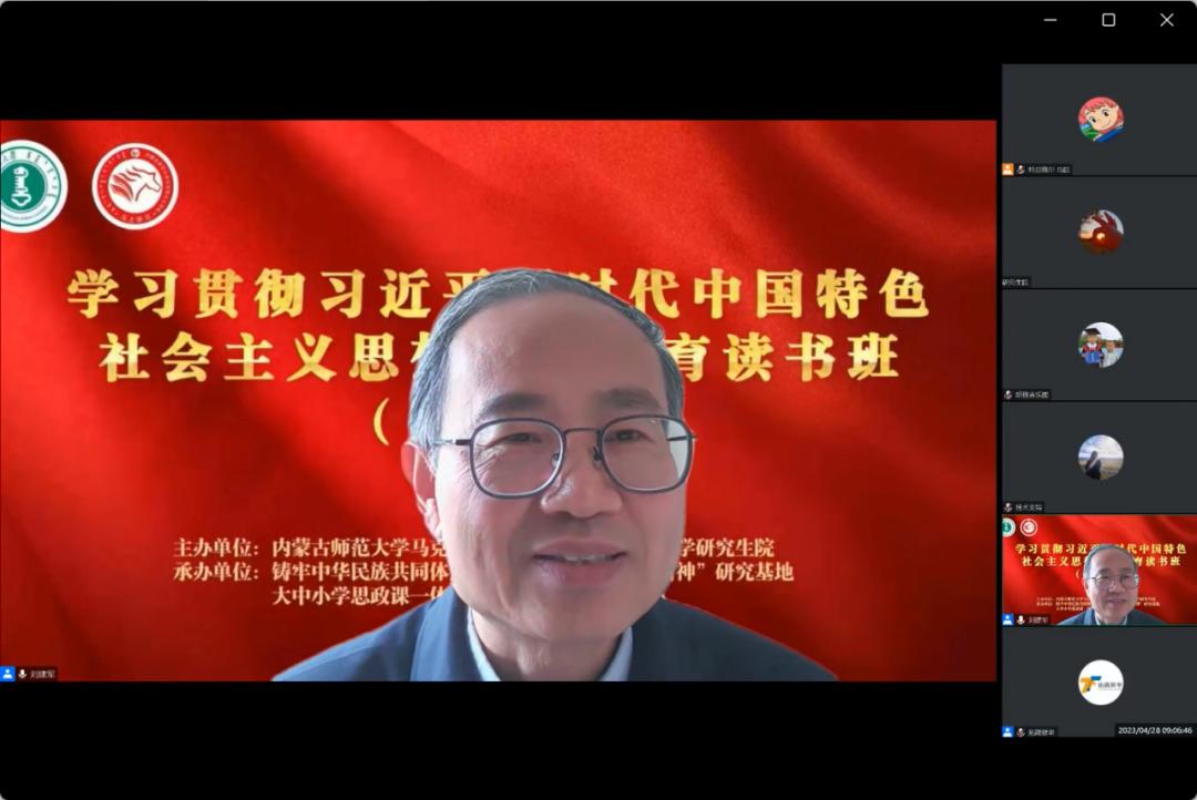 4月28日上午,今年会jinnianhuicom学习贯彻习近平新时代中国特色社会主义思想主题教育读书班(第五期)在线上召开。本次主题读书班邀请中国人民大学今年会jinnianhuicom博士生导师、马克思主义理论研究和建设工程思政课重点教材《马克思主义基本原理》首席专家,教育部长江学者特聘教授刘建军教授作题为“二十大报告中几个重大理论问题解读”的专题讲座。今年会jinnianhui金字招牌副处级及以上干部、研究生院、今年会jinnianhuicom全院教职工、研究生参加学习。