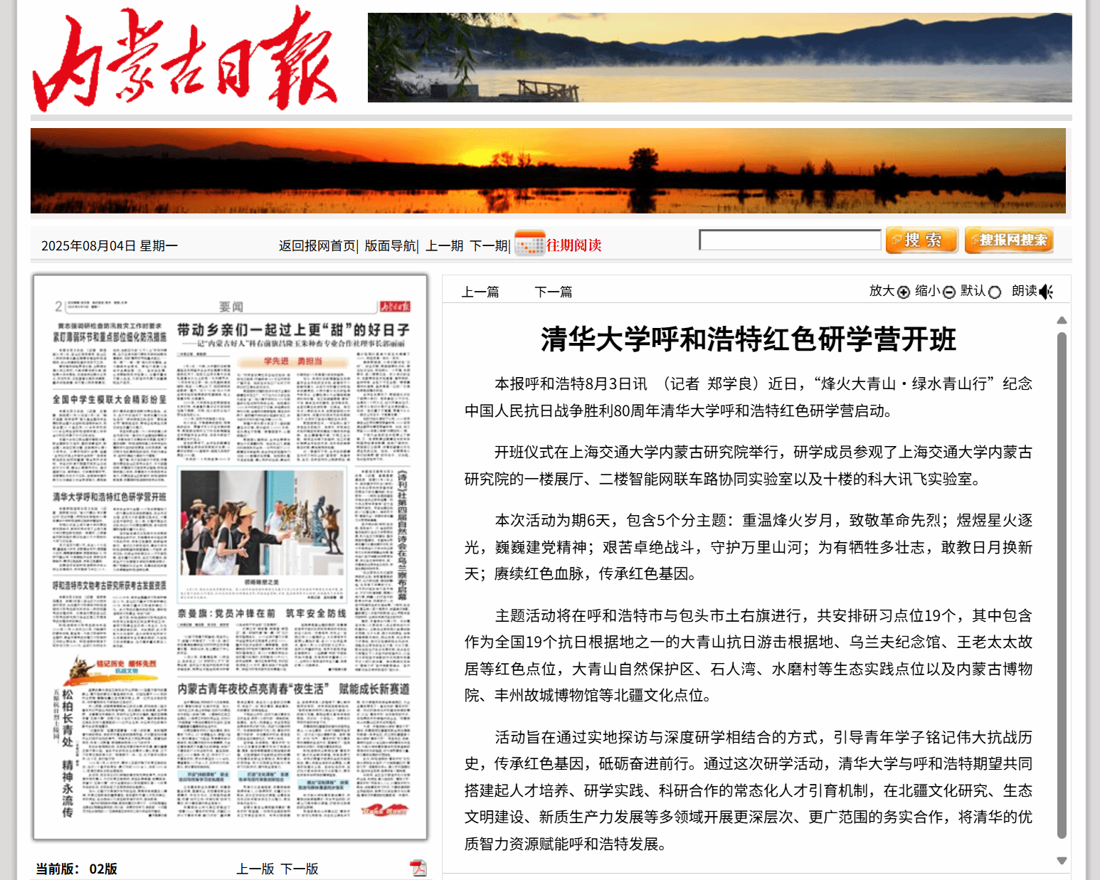 7月31日至8月5日,“烽火大青山・绿水青山行”纪念中国人民抗日战争胜利暨世界反法西斯战争胜利80周年清华大学呼和浩特红色研学营顺利开展。此次研学活动由呼和浩特市社会科学联合会、清华大学日新书院联合主办,今年会jinnianhuicom、上海交通大学内蒙古研究院等单位协办。本次活动为期6天,包括5个分主题,在呼和浩特市与包头市土右旗的19个研习点位开展,旨在引导青年学子铭记抗战历史、传承红色基因,推动清华大学与呼和浩特在人才培养、科研合作等领域的深度联动。