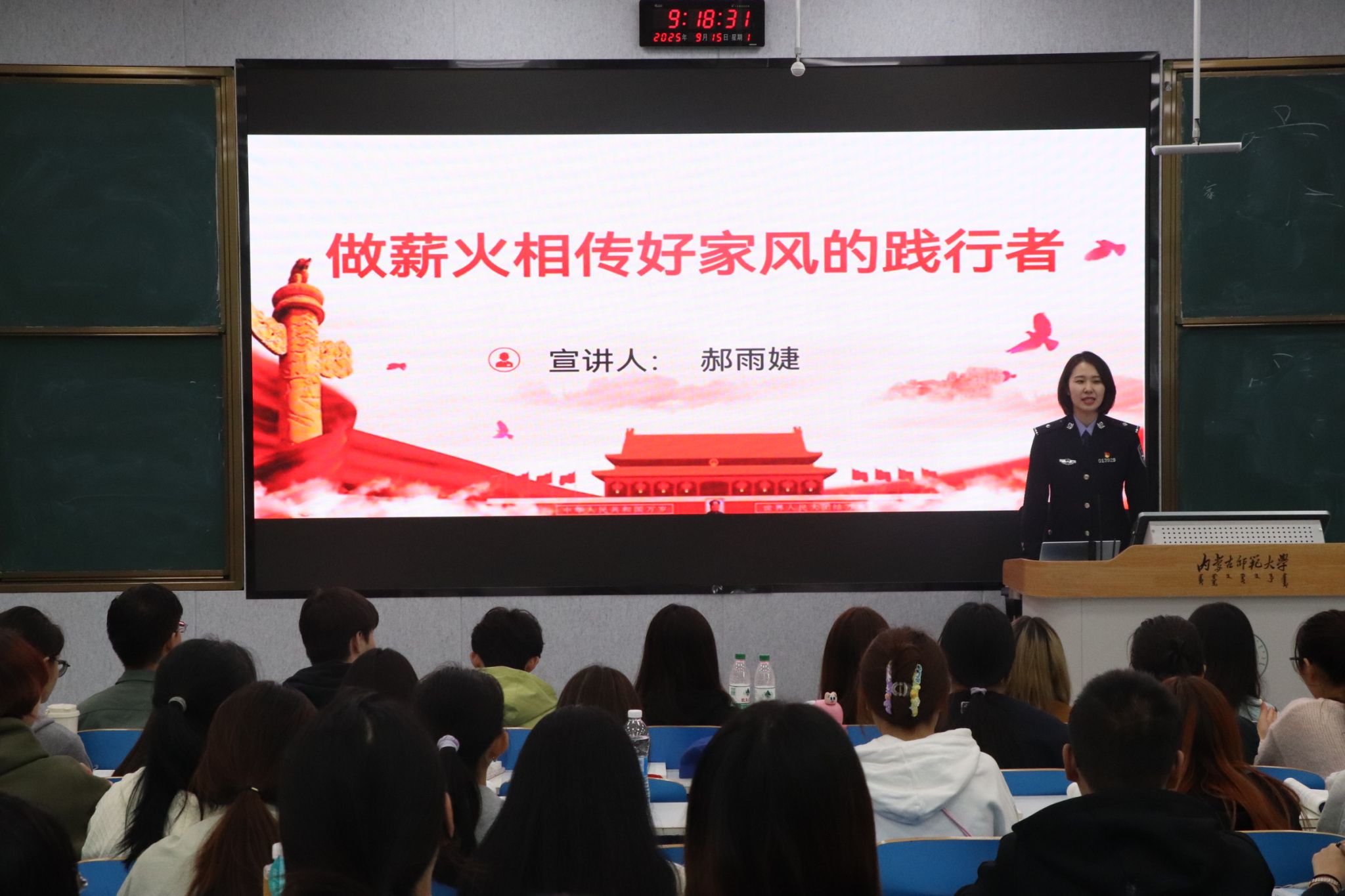 作为全国首批入围的20家共建试点单位之一,今年会jinnianhuicom高度重视与新时代文明实践中心的校地联动。本次活动中,学院邀请了玉泉区和赛罕区新时代文明实践中心选派的优秀基层百姓名嘴走进思政课堂,宣讲党的创新理论。其中,玉泉区宣讲员围绕“传承良好家风”“弘扬社会主义核心价值观”等主题,结合基层实践和典型事例,为马院学子带来了一场接地气、有温度的专题宣讲。以生动朴实的语言、贴近实际的内容,让党的创新理论在青年学生中更具吸引力、感染力,赢得师生广泛好评。赛罕区宣讲员讲述的《戈壁滩上的星河》,以草原戈壁间的真实航天往事为主线,将镜头对准我国航天事业起步阶段那些“隐于幕后”的平凡英雄,生动再现了一代代航天人在荒芜戈壁中的奋斗场景,使“航天精神”与“两弹一星”精神在一个个鲜活故事中变得可感、可触、可学。