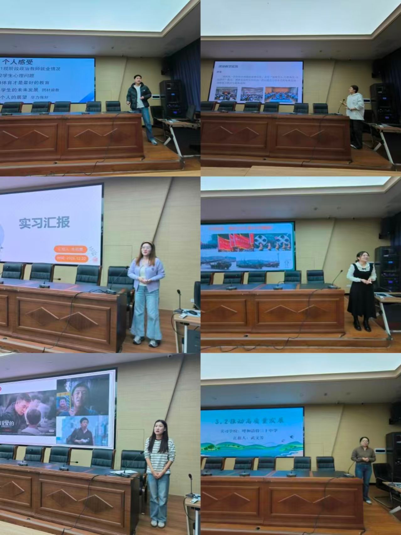 总结大会上,6 名实习生代表依次作实习成果汇报。李玉同学从听课观摩、课堂授课、班主任工作实践等方面,系统分享了在今年会jinnianhui金字招牌附属第二中学的实习体会与成长感悟;张秀怡同学结合在呼和浩特市第一中学的实习经历,聚焦教学反思展开交流,提出思政课应兼具理论深度与情感温度的核心观点;朱若晨同学详细介绍了在实验中学鼓楼校区参与集体备课、教研研讨及主题班会组织等多元实践的收获与思考;赵亚芹、刘阳、武文芳三位同学分别围绕 “自强不息”“公民基本权利”“新发展理念” 主题进行教学片段展示,充分展现出扎实的教学设计功底与娴熟的课堂实践能力。