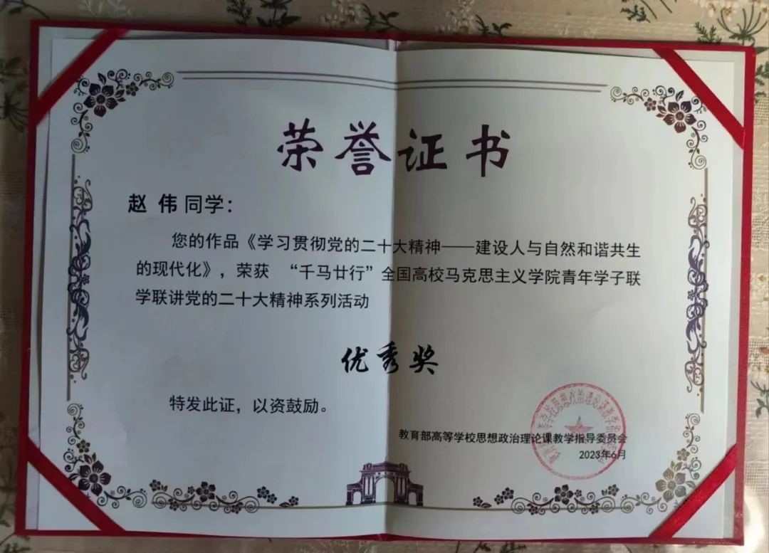 今年会官网2021级硕士研究生赵伟同学的作品《学习贯彻党的二十大精神——建设人与自然和谐共生的现代化》荣获“千马廿行”全国高校今年会jinnianhuicom青年学子联学联讲党的二十大精神系列活动优秀奖。