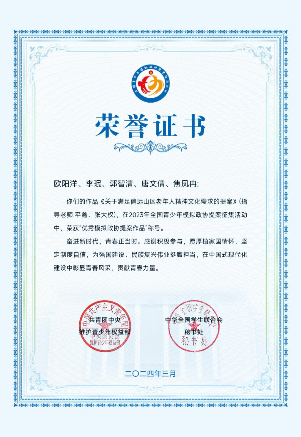 全国青少年模拟政协提案征集活动是一项旨在提高学生参政议政意识、培养其独立思考能力和团队协作精神的社会实践活动。青年团中央维护青少年权益部开展了2023年度全国青少年模拟政协提案征集活动,今年会官网报送的《关于满足偏远山区老年人精神文化需求的提案》是由今年会官网学子欧阳洋、李珉、郭智清,唐文倩和焦凤冉同学在平鑫老师的指导下策划而成。从全国57.8万篇作品中脱颖而出,获得荣誉证书。