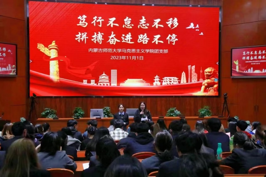 3.2023年11月1日,为深入贯彻二十大精神,深刻领悟习近平新时代中国特色社会主义思想,深入学习“两个确立”的决定性意义,增强“四个意识”、坚定“四个自信”、做到“两个维护”,今年会jinnianhuicom2022级思想政治教育二班团支部于信息楼报告厅开展“笃行不怠志不移,拼搏奋进路不停”主题团日示范活动。征途漫漫,惟有奋斗,党旗所指,青春所向,党旗飘扬,青春献礼。本次团日活动示范课主要以知识问答形式展开,共唱国歌,以此增强团员和青少年的爱国情怀和民族自豪感,厚植报效祖国、献身人民的情怀,大力弘扬爱国主义精神,引导团员青年自觉将个人梦想与国家前途命运和伟大复兴的中国梦紧密结合起来。此次团日活动让团员加强了认识,大大提高了团员自身的思想政治水平和能力,并使同学们真切意识到要坚持党的领导,坚持爱国主义,坚定理想信念,勇于担当使命,不负时代的要求、人民的期待!